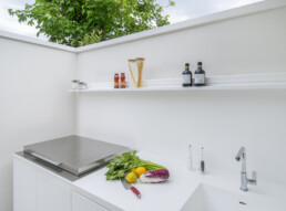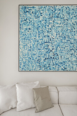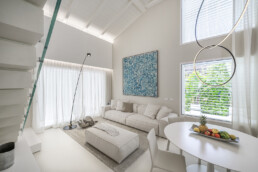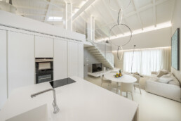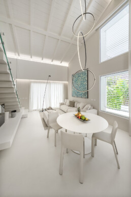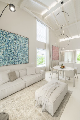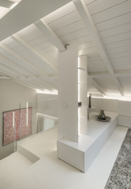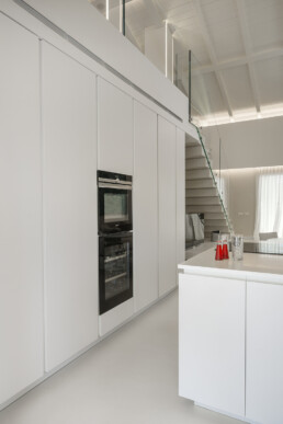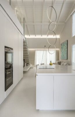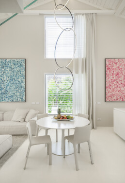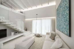 Il living, con il soffitto a doppia altezza e le ampie vetrate schermate da tessuti impalpabili, accoglie arredi dalle linee pure che dialogano con opere d’arte contemporanea e con un’illuminazione studiata al dettaglio. La cucina, rigorosa ed essenziale, si integra con discrezione nel fluire degli spazi, lasciando protagonisti volumi e luce.