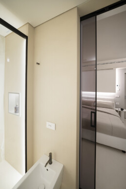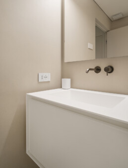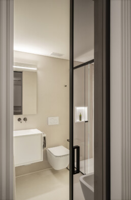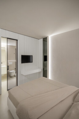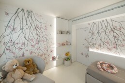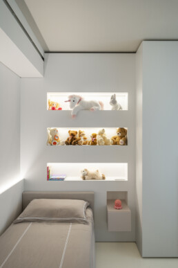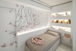 La zona notte rivela un approccio intimo e sofisticato: camere da letto minimaliste ma calde, una cameretta impreziosita da un wall decor poetico e naturale, fino ai bagni, definiti da geometrie pulite e dettagli raffinati.