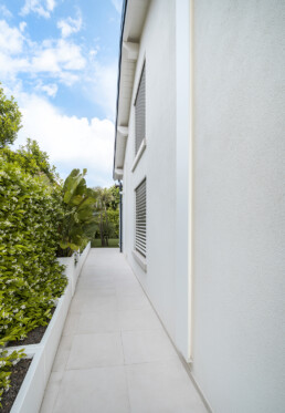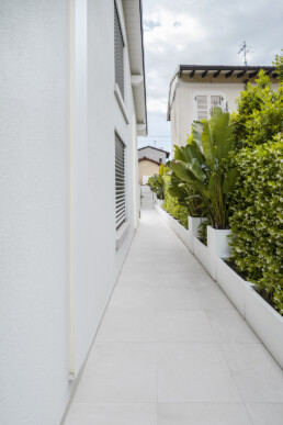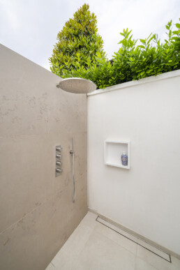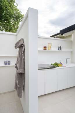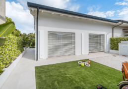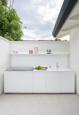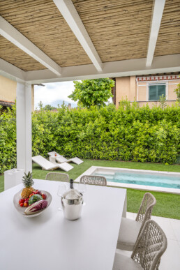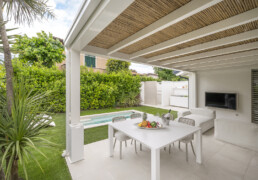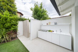 All’esterno, il progetto si apre su un giardino privato con piscina e cucina outdoor: un’estensione naturale della casa, pensata per vivere momenti conviviali in un continuum armonico tra dentro e fuori.
