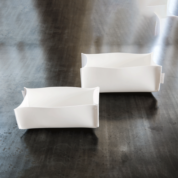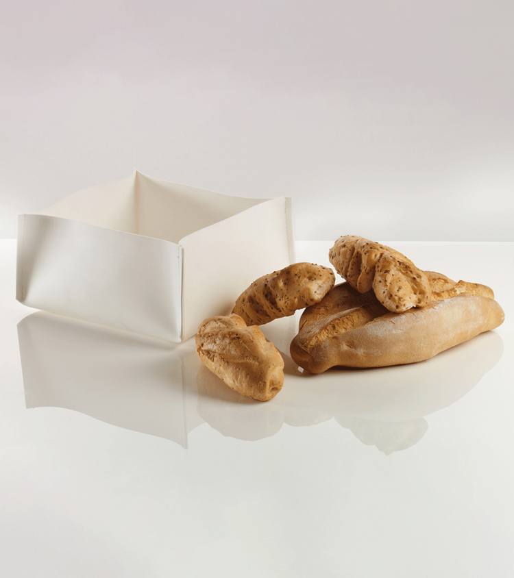La sua forma squadrata ma fluida, ottenuta tramite cuciture laterali che sembrano modellare una piccola architettura domestica, lo rende un oggetto versatile: perfetto per servire pane e focaccine, ma anche per accogliere frutta, piccoli oggetti o come dettaglio decorativo in cucina e in sala da pranzo.