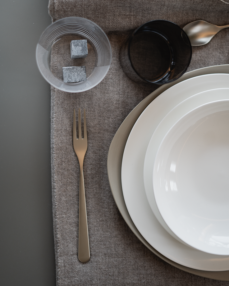 | COMPOSIZIONE | SOTTOPIATTO GRIGIO, PIATTO PIANO, PIATTO PIANO PICCOLO, PIATTINO PER IL PANE, CIOTOLINA, TOVAGLIA, CUCCHIAI, FORCHETTE, COLTELLI, CUCCHIANI, BICCHIERI ACQUA, BICCHIERI VINO, BICCHIERI ALCOLICI |