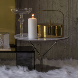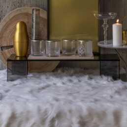 La texture materica, quasi lunare, racconta l’origine geologica del materiale e dialoga con la trasparenza dei bicchieri come un contrasto studiato. Basta riporle in freezer e, una volta fredde, diventano l’alleato ideale per whisky, rum, amari o distillati da meditazione.